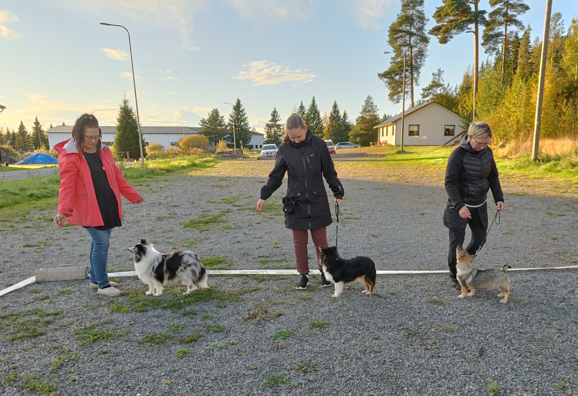 Syksyllä 2025 kurssilla olivat muun muassa Meiccu ja shetlanninlammaskoira Frida (vas.), Ida ja shetlanninlammaskoira Jalo sekä Eveliina ja länsigöötanmaanpystykorva Nuka.