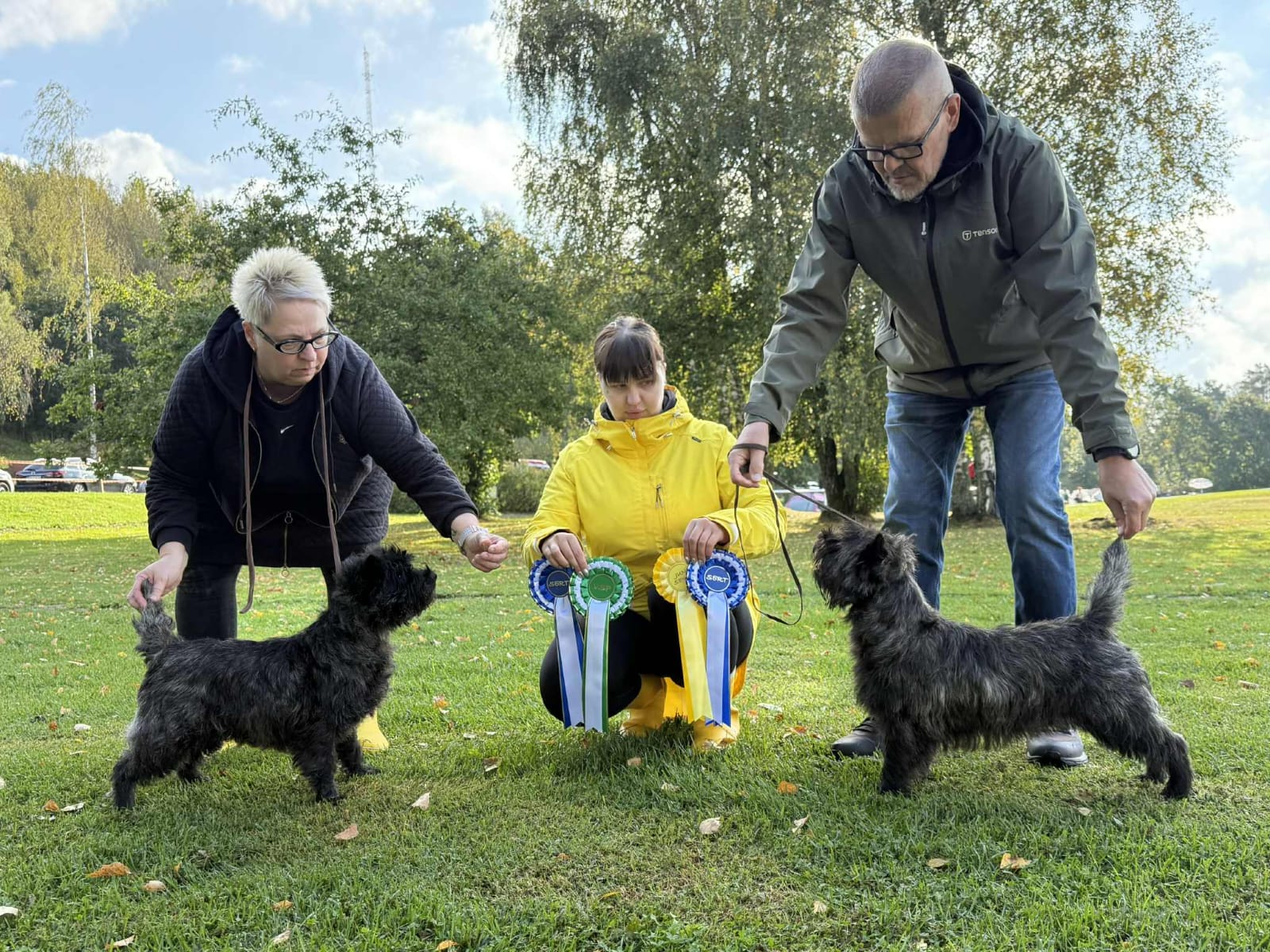 Anu Ahon cairnterrierikasvatit keräsivät ruusukkeita Porvoon kaikkien rotujen näyttelystä 13. syyskuuta. Zalimar Kiss From A Rose (vas.) voitti avoimen luokan, oli rodun paras narttu, sai toisen sertifikaatinsa ja oli VSP. Zalimar Original Sir Fenix voitti junioriluokan, oli rodun kolmanneksi paras uros ja sai sekä sertifikaatin että juniorisertifikaatin tullen juniorimuotovalioksi ja ollen JUN-VSP. Tuomarina Tanya Ahlman-Stockmari. Kuvassa Anu, Maria ja Jari Aho.